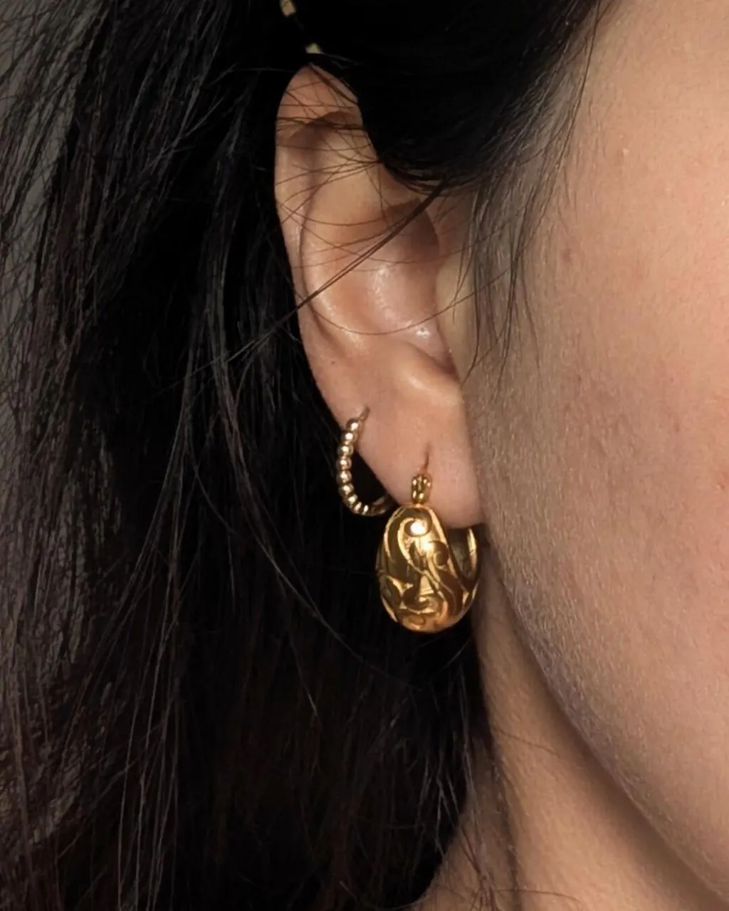 Intricately detailed with a filigree inspired design, the Lorena hoops are chubby, lightweight and take you from day to night effortlessly.