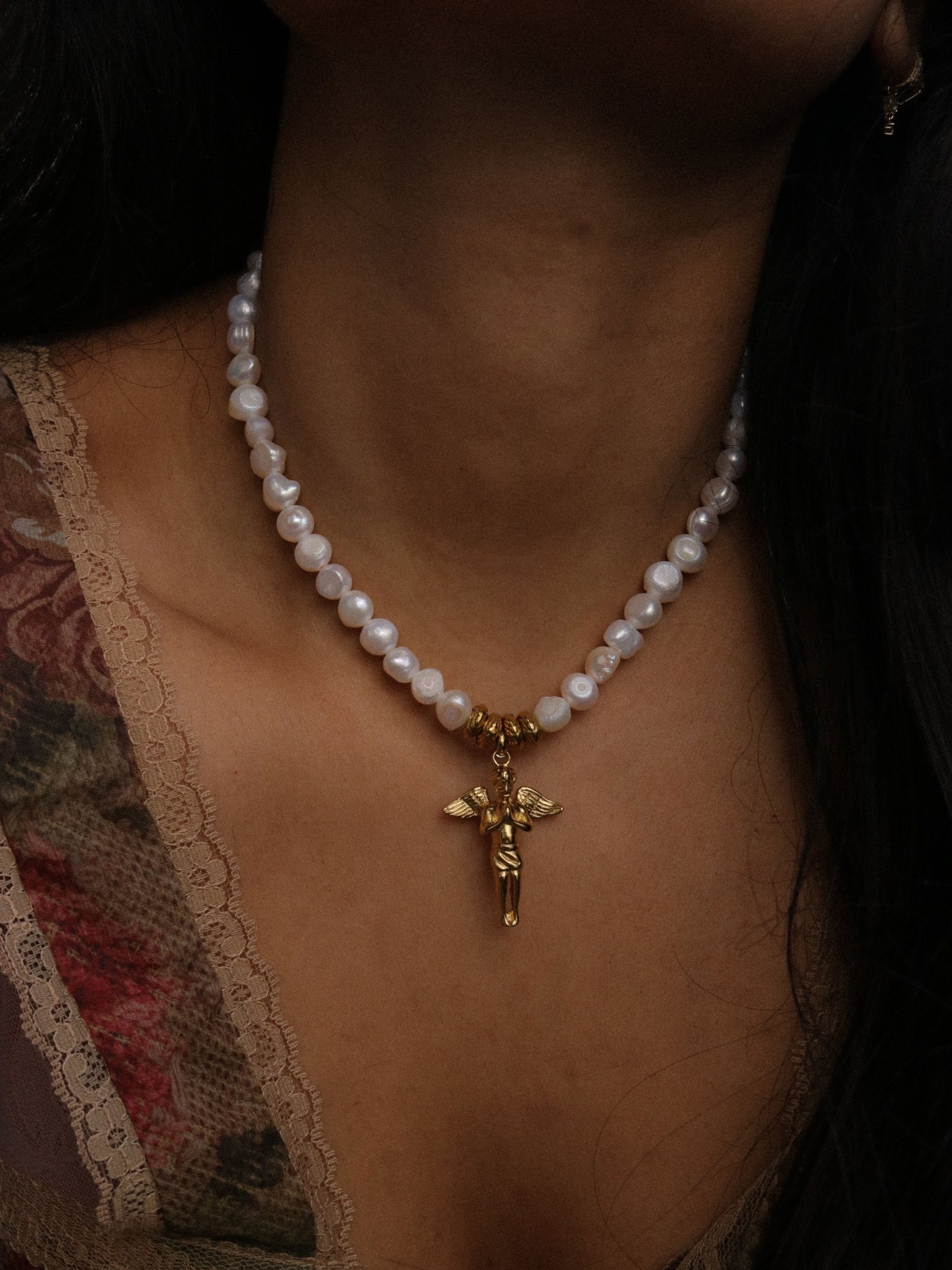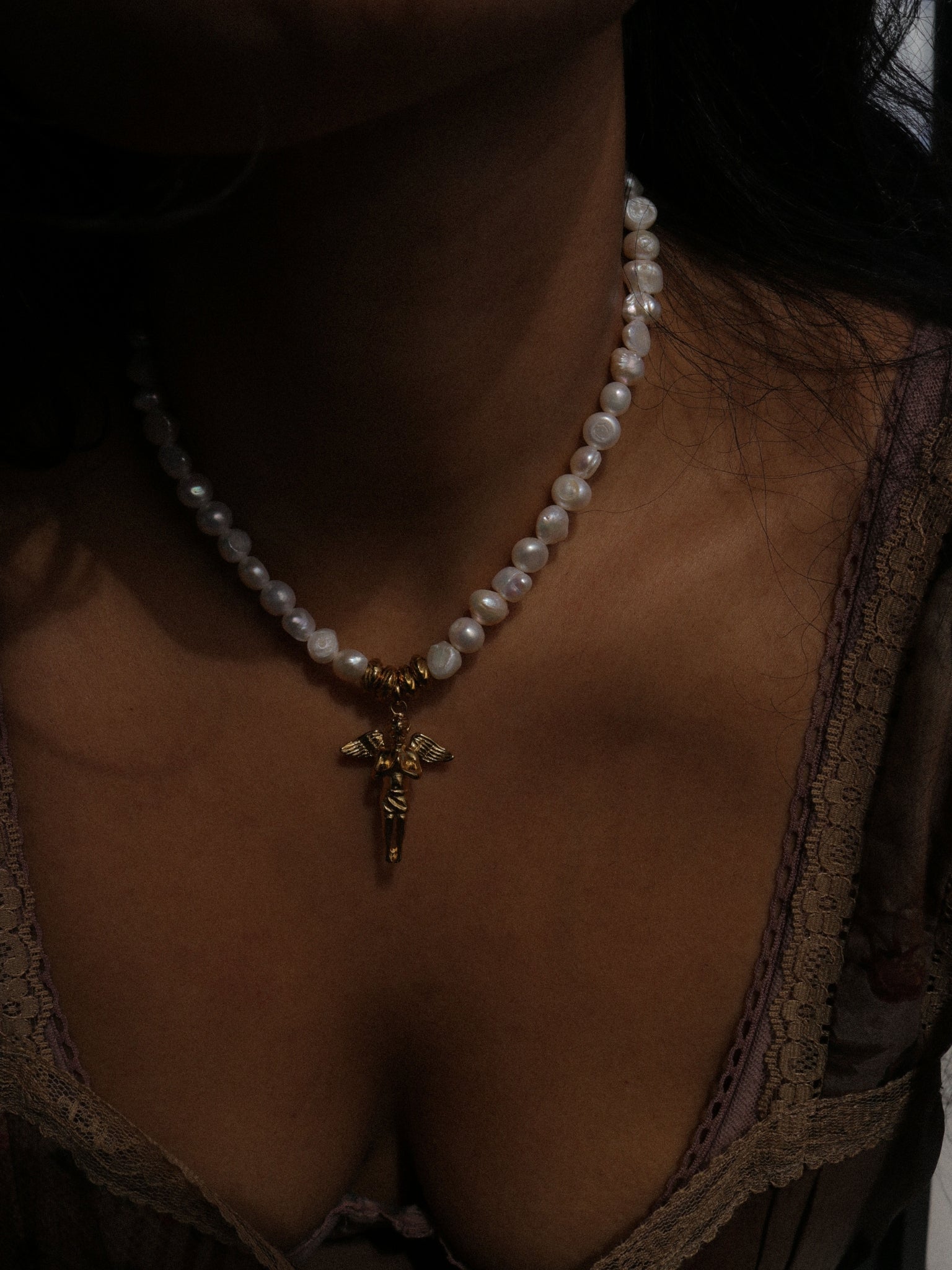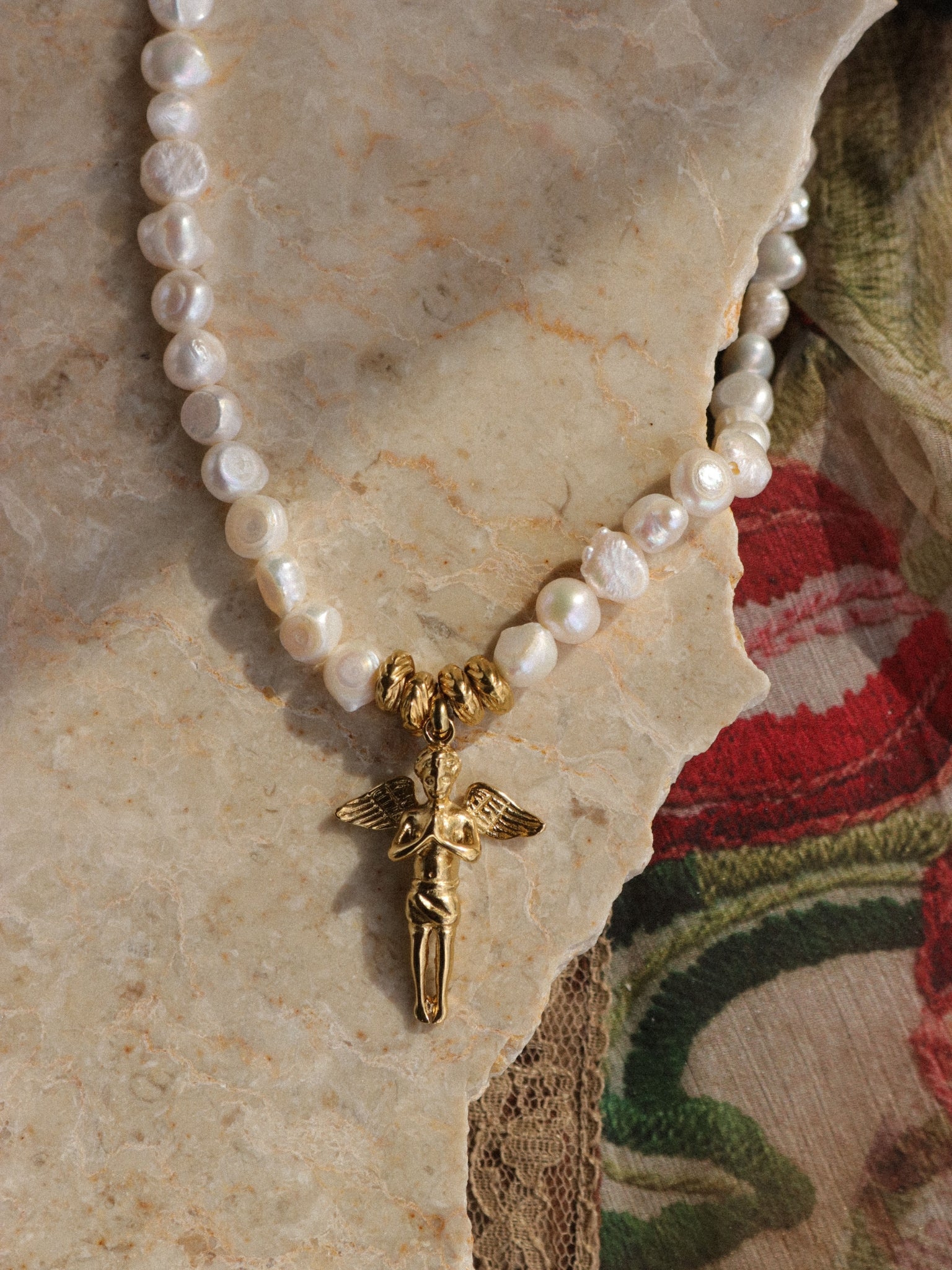 The Freshwater Pearl Choker is designed for the girl who collects beautiful things and wears them her own way. Inspired by antique jewellery and Renaissance iconography, this piece pairs luminous baroque pearls with a delicate cherub pendant — a symbol of devotion, protection, and quiet romance.