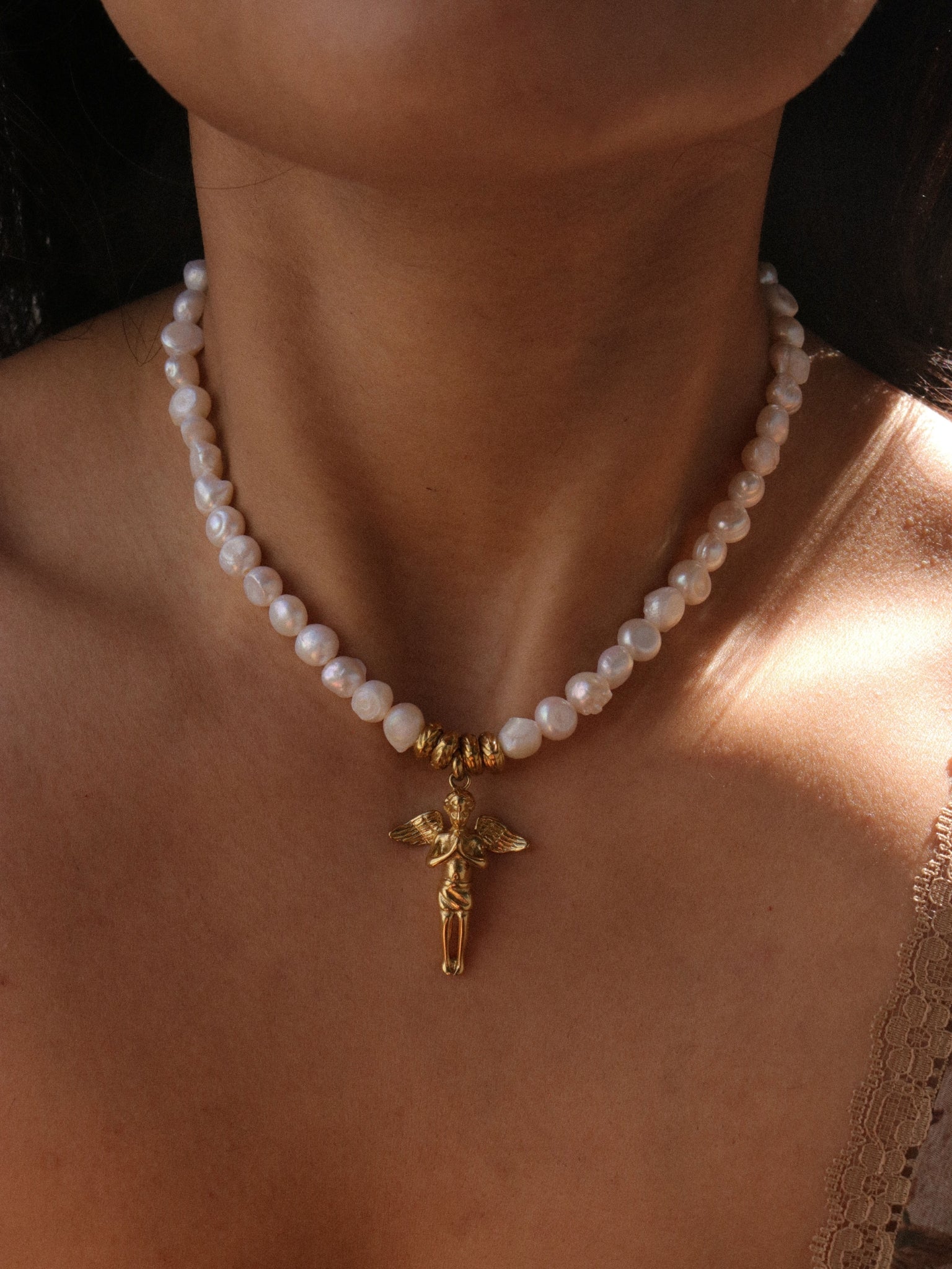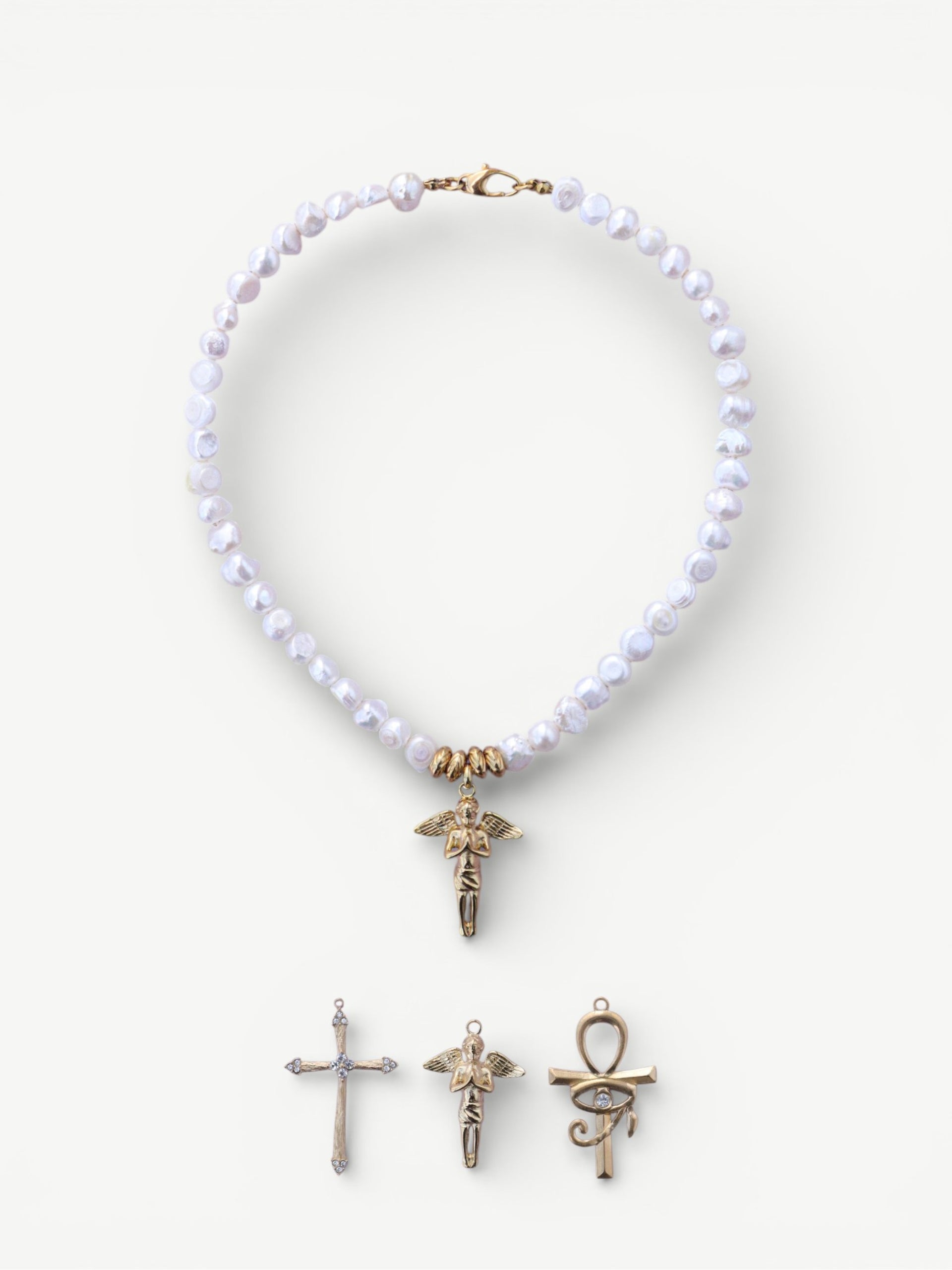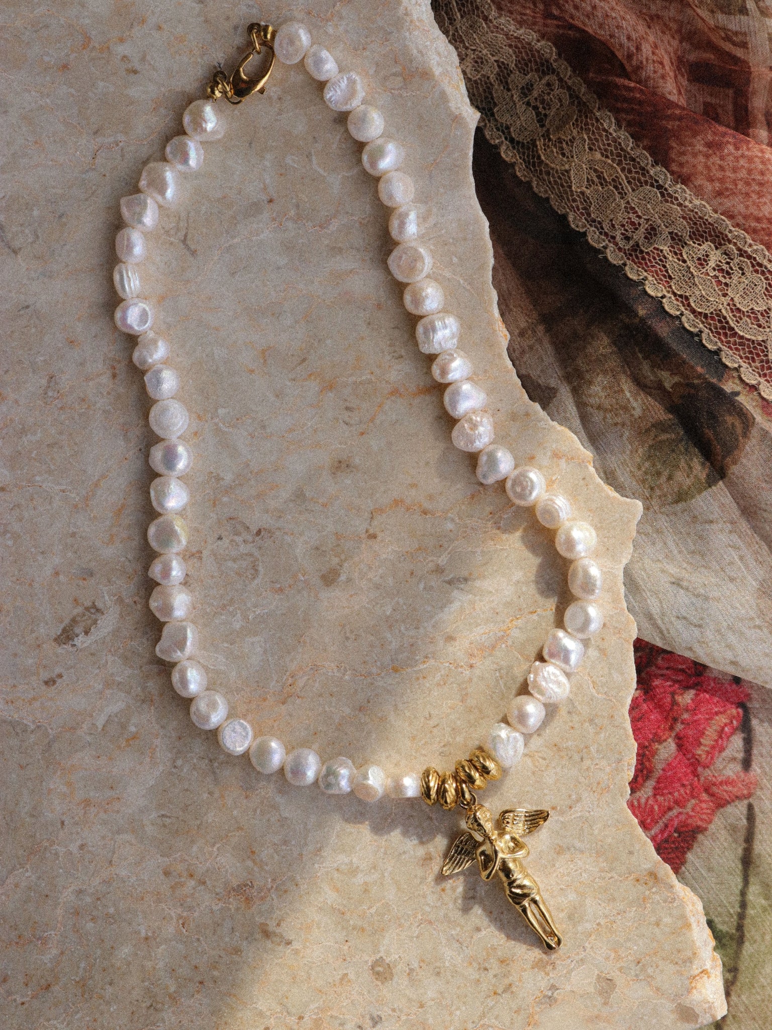 Each necklace features large irregular freshwater pearls, giving every piece its own natural character and vintage feel. The centre pendant is customisable, allowing you to choose from three different angel-inspired charms to create a choker that feels uniquely yours.
