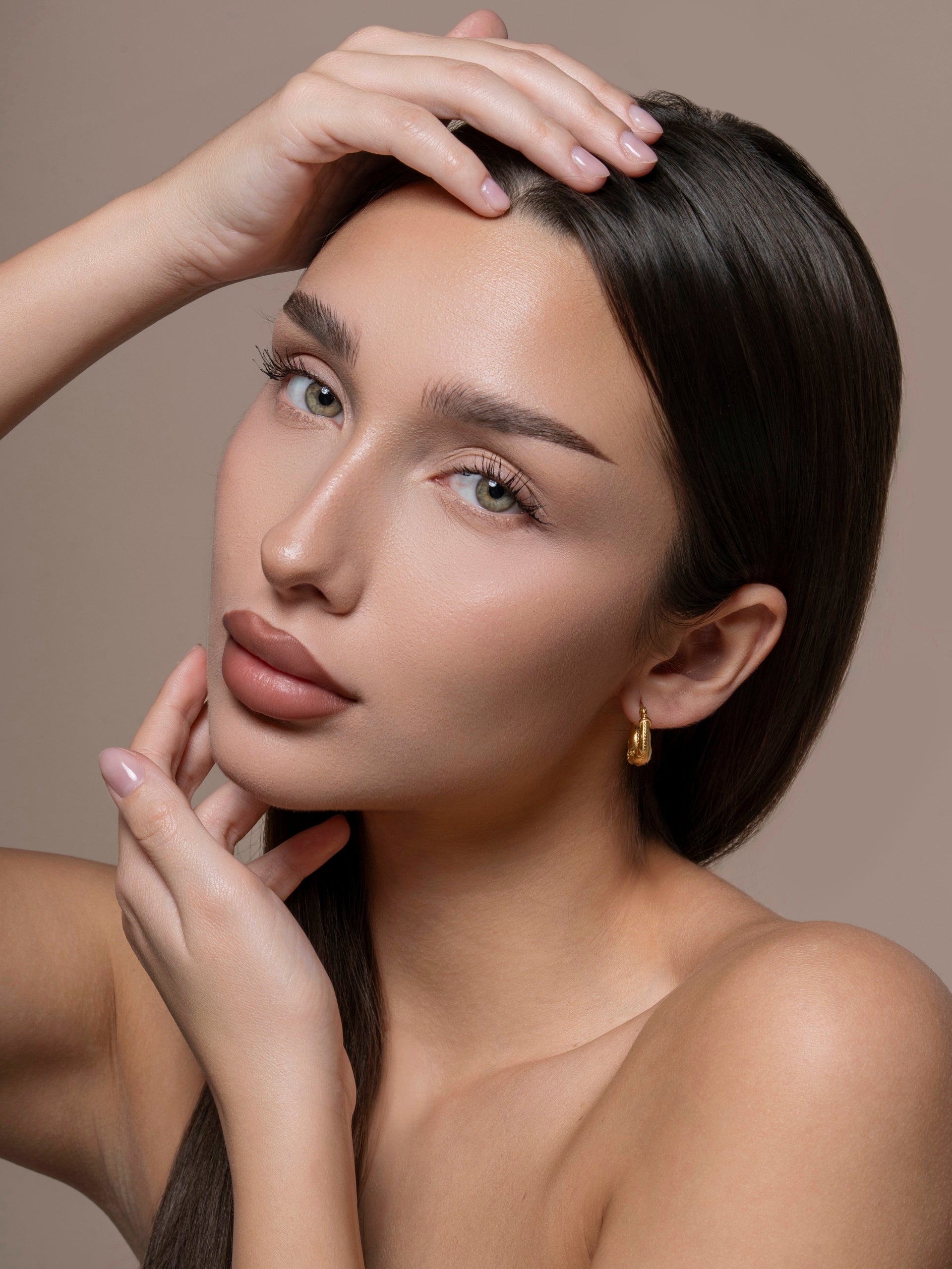 Created with a face framing drop hoop shape, enrobed in 18kt Gold.