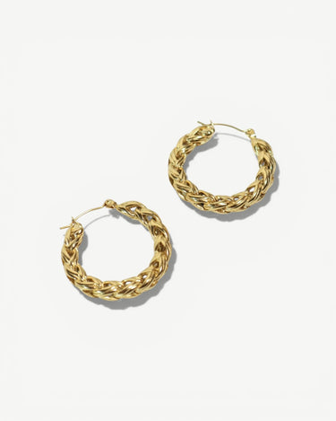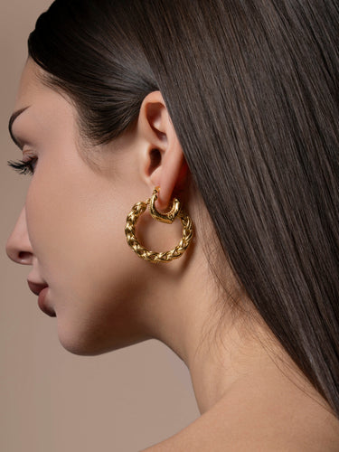 With intricate braided detailing, the GAIA hoops are beautifully bold. Created with 18K gold plated stainless steel, this hoops design exudes a subtle regality. Medium sized with an outer diameter of 32mm, they are the ultimate accessory to add to your outfit for a glamorous feel.