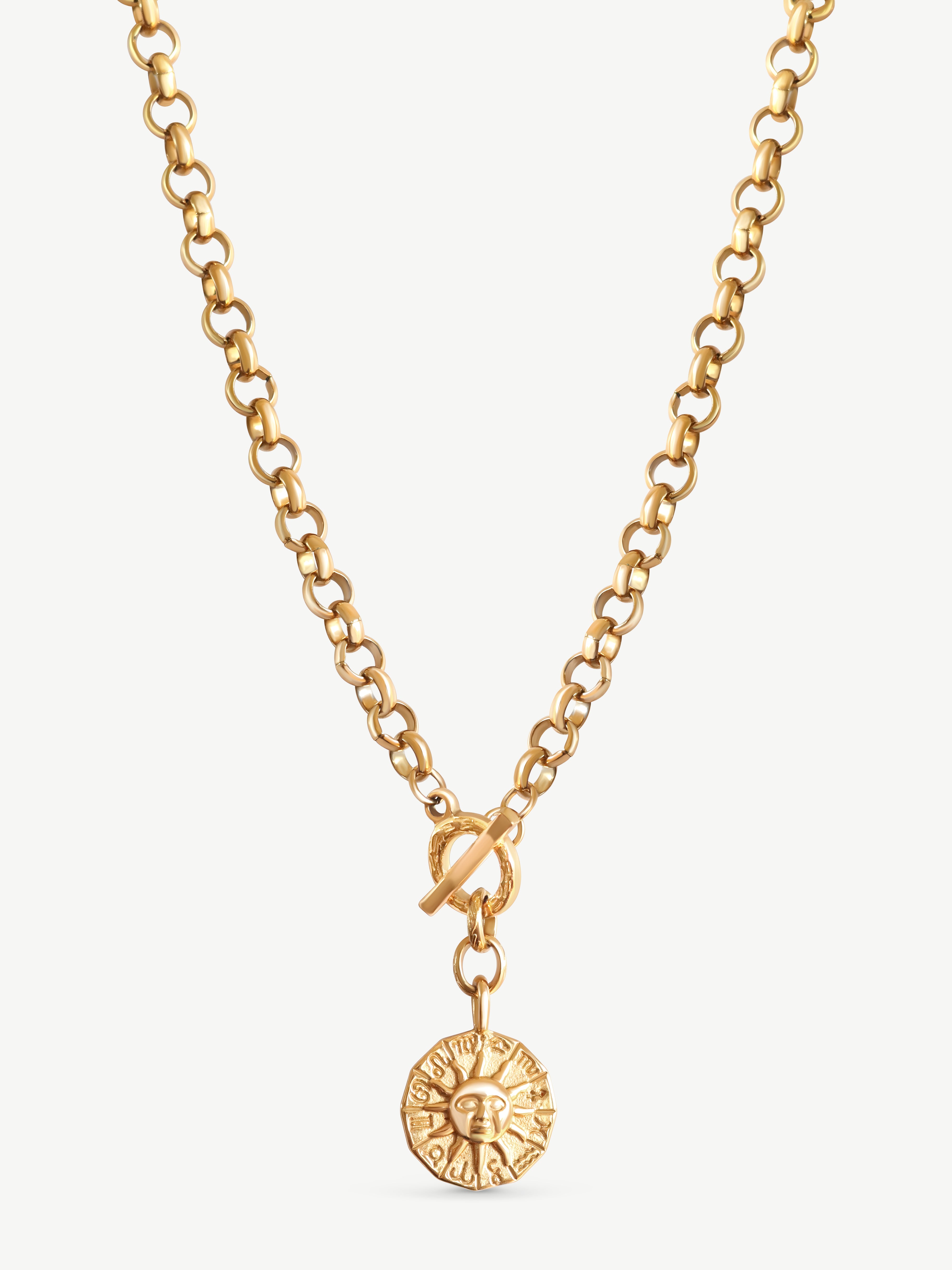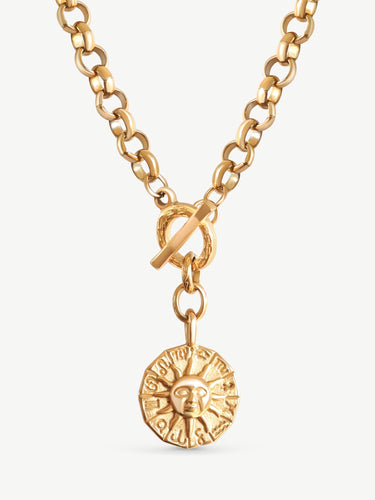 Created with a Rolo chain and rustic toggle clasp. Featuring our double sided sun zodiac wheel pendant.